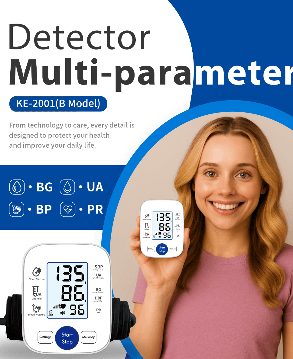 【Product Name】3-in-1 Smart Multi-Parameter Monitor (blood glucose, blood pressure, uric acid 3 in 1) – English Version; includes 25pcs blood glucose test strips+10pcs uric acid test strips 【Model】 KE-2001 (B Model) 【Measurement Method】 Upper Arm / Oscillometric Method 【Arm Circumference】 22–32cm 【Functions】 4-in-1 Measurement: Blood Pressure, Pulse, Blood Glucose, Uric Acid 【Measurement Time】 Uric Acid approx. 9s, Blood Glucose approx. 4s 【Memory Capacity】 90 × 2 sets (Dual user storage) 【Power Supply】 4 x AAA batteries 【Key Features】 All-in-one monitor for Glucose, Uric Acid, BP, & Pulse; HD large screen; Smart voice broadcast; Imported chip; Intelligent pressurization technology; 360° easy-fit…